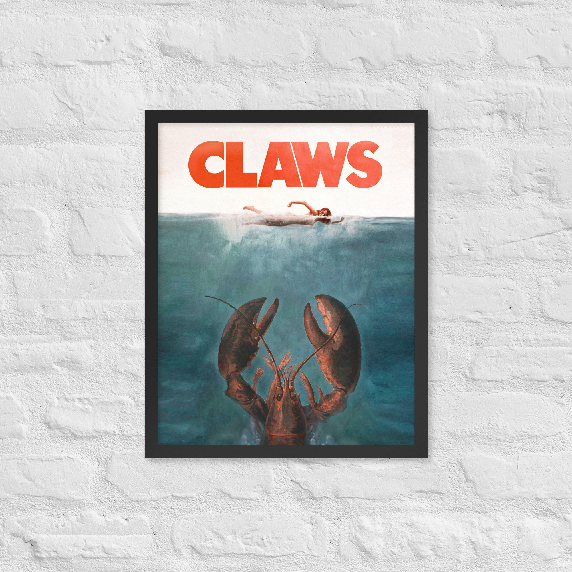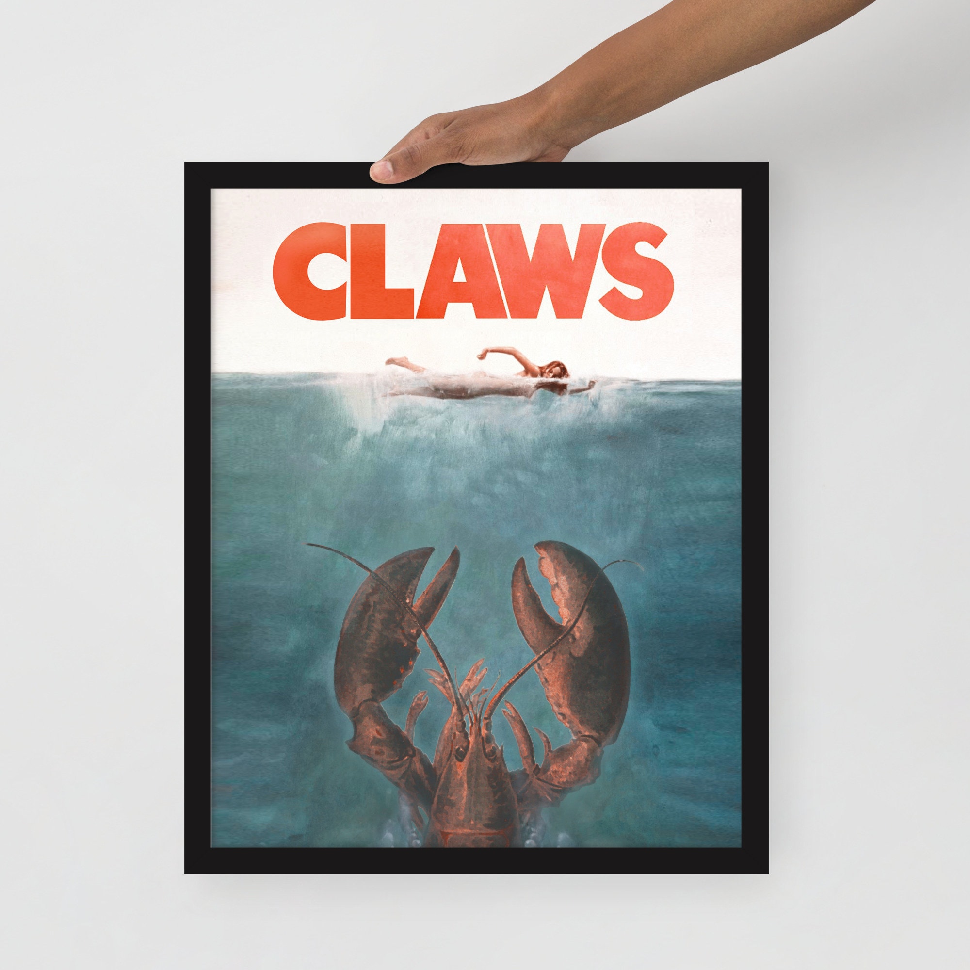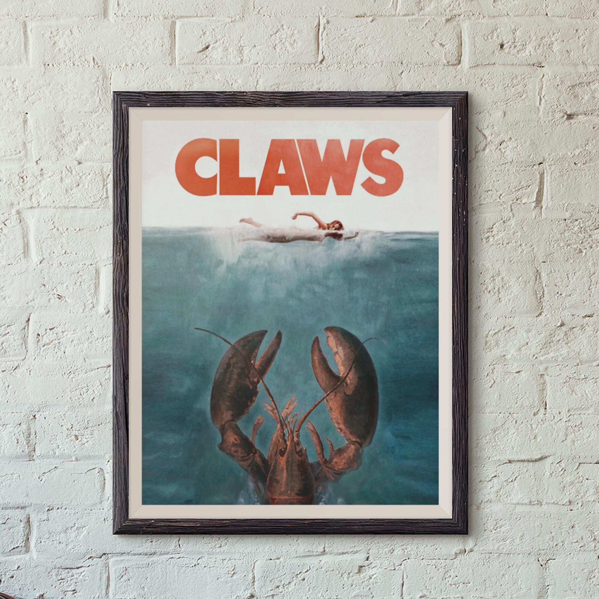 A parody of the iconic movie "Jaws" that brings the ocean's mightiest predator to new, comical depths. Forget about the fear of sharks, because now it's time for lobsters to take center stage! This Claws poster is the perfect Maine home decor or gift for any lobster lover.