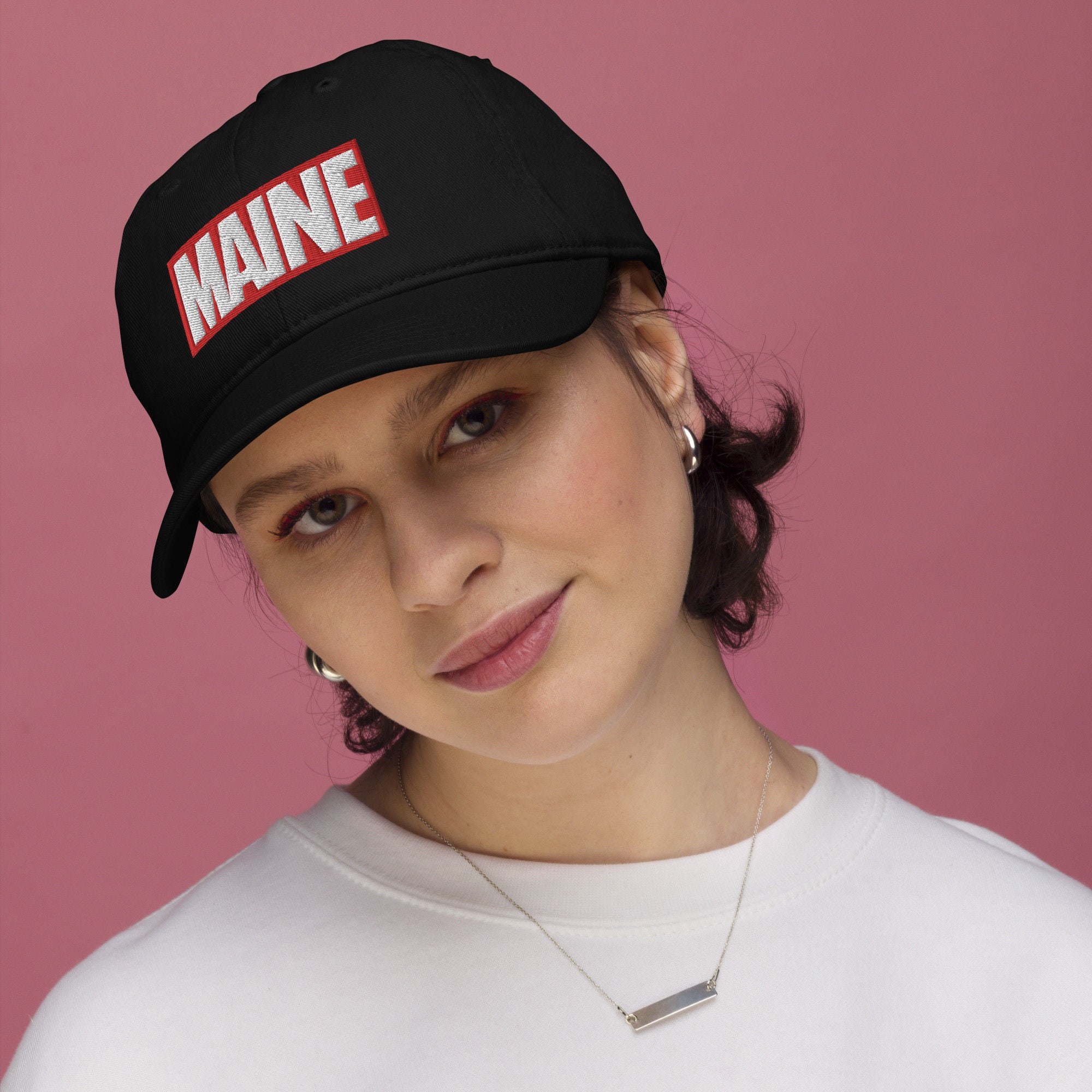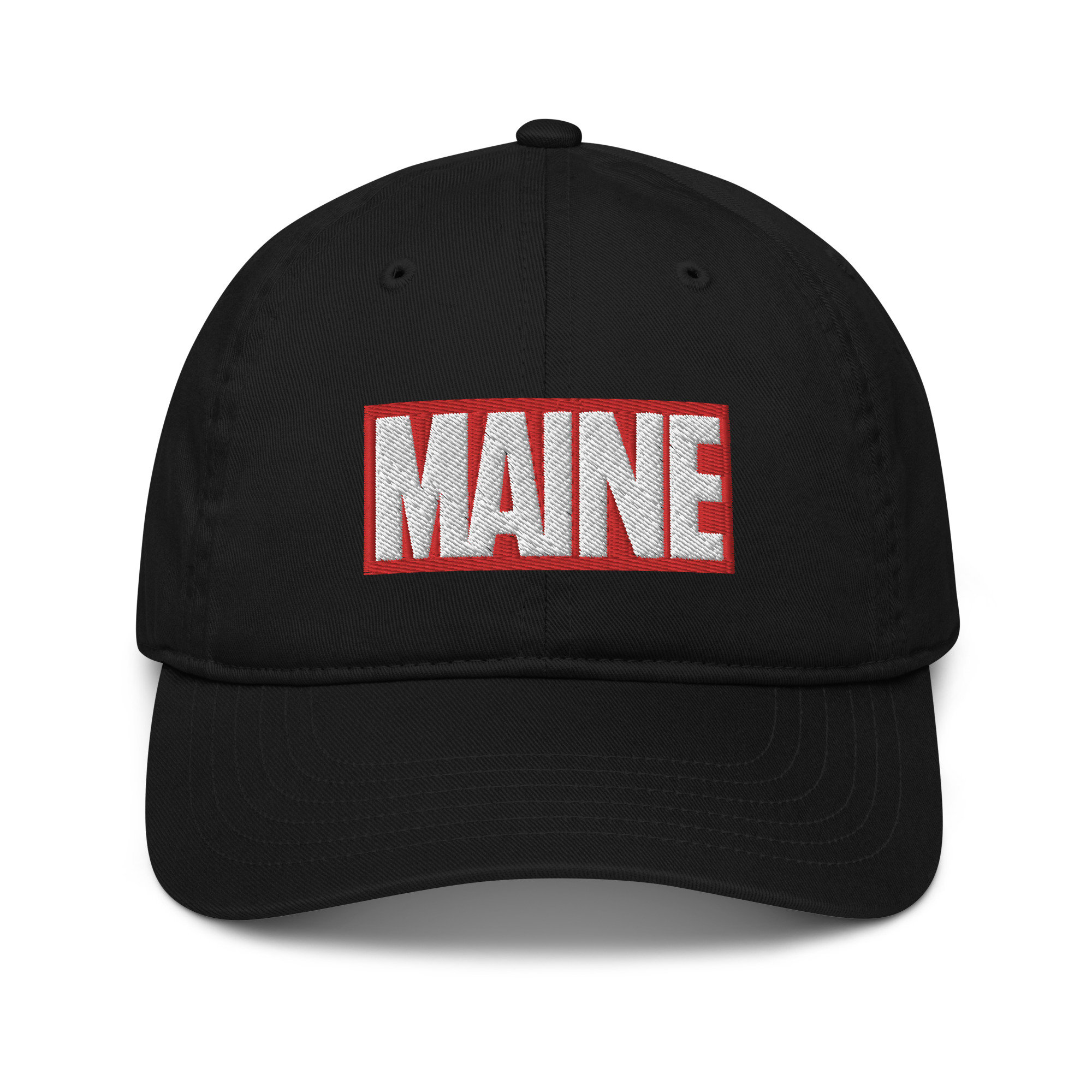 Perfect for any Maine comic book fan... This embroidered Maine Marvel hat is made of organic cotton with a curved visor and adjustable strap. A Bat Moose dad hat is the perfect Mainer gift.